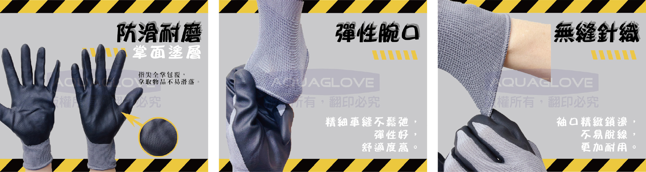 PU 塗層手掌具良好止滑效果,觸感細膩,適合需要手感與靈活度的作業環境,長時間配戴仍保持舒適。